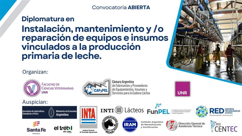 DIPLOMATURA UNR-CAFyPEL: en instalación, mantenimiento y/o reparación de equipos e insumos vinculados a la producción primaria de leche 27/3/2024![]() DIPLOMATURA EN INSTALACIÓN, MANTENIMIENTO Y/O REPARACIÓN DE EQUIPOS E INSUMOS VINCULADOS A LA PRODUCCIÓN PRIMARIA DE LECHE 🐄 Objetivo General 📌 Formar recursos humanos calificados en el funcionamiento de los equipos vinculados a la producción primaria de leche, contribuyendo a mejorar la eficiencia del proceso productivo. Objetivos Específicos 📌 Conocer y entender el proceso de ordeño en un contexto productivo sustentable. 📌 Adquirir los conocimientos teóricos indispensables para comprender el funcionamiento de los componentes y equipos vinculados a la producción primaria de leche. 📌 Desarrollar habilidades que les permitan instalar, supervisar y/o reparar el funcionamiento de los equipos vinculados a la producción primaria de leche. 🎬 Inicia: 05/04/2024 📅 Duración: 8 meses (13 encuentros). ✔ Cursado: viernes de 9:00hs a 18:00hs, cada 21 días. 👨 Modalidad: Presencial. 🔊 ÚLTIMAS VACANTES !! 📥 Inscripción: info@cafypel.org.ar/leandro.ugalde@fcv.unr.edu.ar