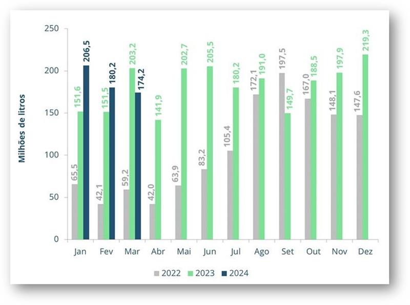 Las importaciones mensuales de lácteos continuaron disminuyendo en el último mes y alcanzaron el nivel más bajo en 2024, hasta la fecha; a pesar de seguir registrando un volumen considerado alto. En total, en marzo se importaron 174,2 millones de litros de equivalente de leche, registrando un descenso mensual del 3%. Al comparar con marzo de 2023, la variación observada fue de -14%, cuando se importaron alrededor de 30 millones de litros equivalentes de leche más que lo registrado en el último mes, como se muestra en el gráfico siguiente.