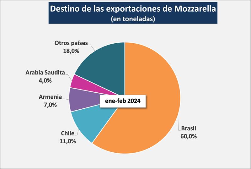 En el gráfico que se adjunta a continuación se muestra la participación de las exportaciones de mozzarella de Argentina para el primer bimestre de 2024, según el destino comercial.