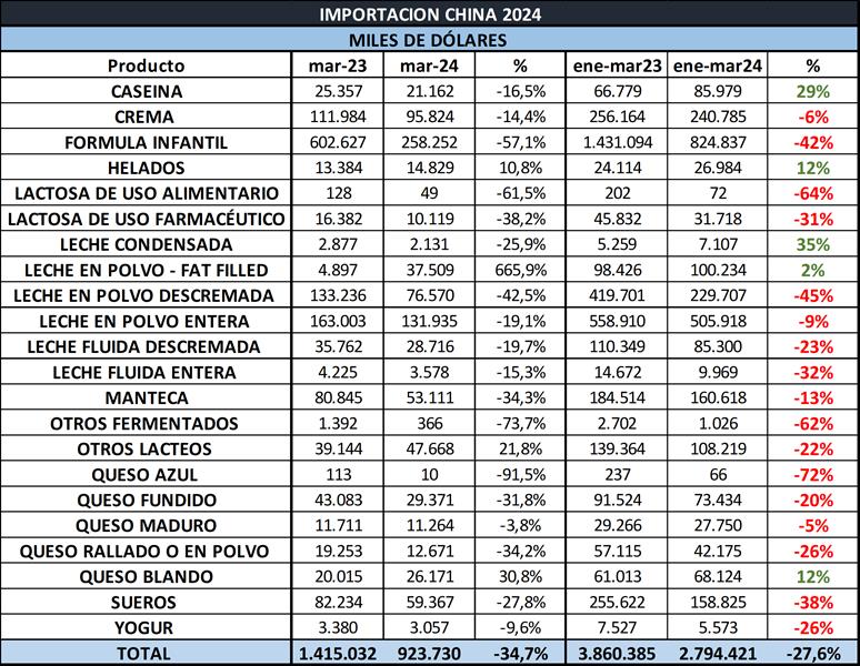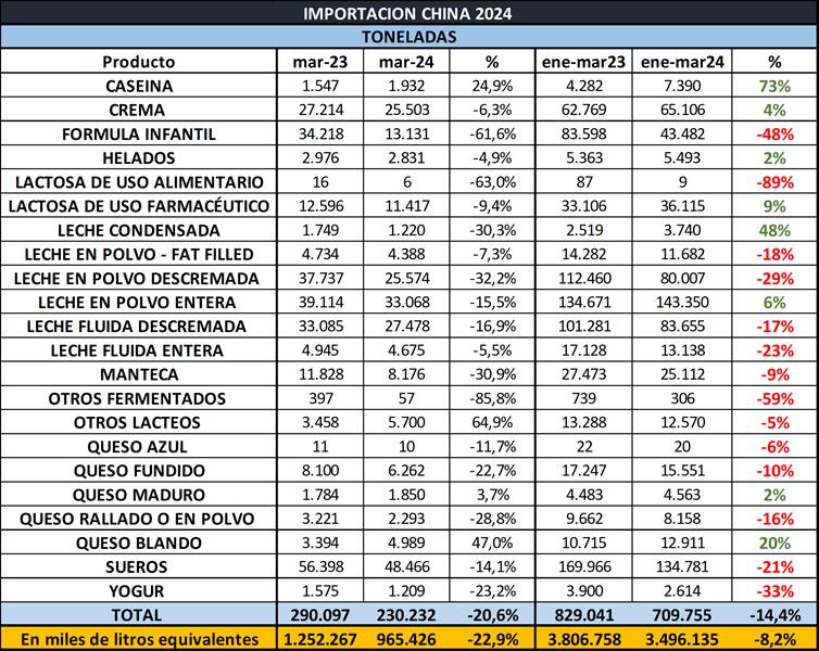 CHINA: importaciones de productos lácteos a enero-marzo de 2024 23/4/2024
