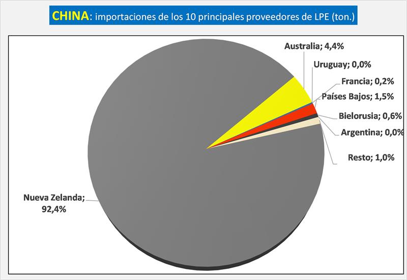 China es el principal importador de Leche en Polvo Entera y su principal proveedor es Nueva Zelanda quien ostentó el 92,4% de participación de ese producto en el gigante asiático en lo que va de 2024, casi idéntica a la participación del 2023 que fue del 92,2% para igual período.