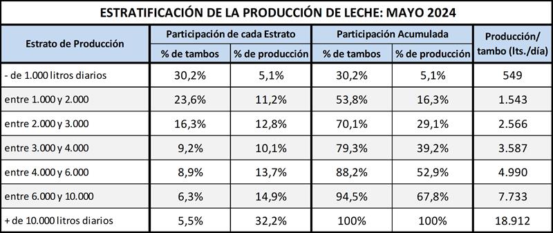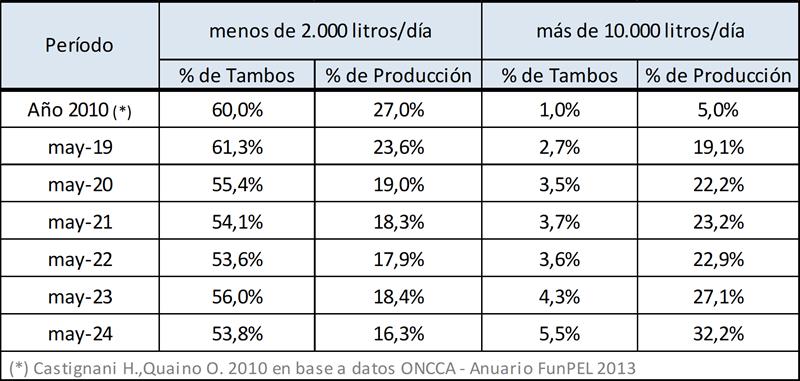 Puede verse en el cuadro siguiente al comparar con datos disponibles del año 2010, que en un extremo disminuye la participación tanto en cantidad de tambos como en el volumen de producción de las unidades productivas de menos de 2.000 litros diarios y en el otro extremo de la estratificación, se incrementa la participación de las unidades de más de 10.000 litros diarios, situación esta última, atemperada por la mencionada baja de producción.