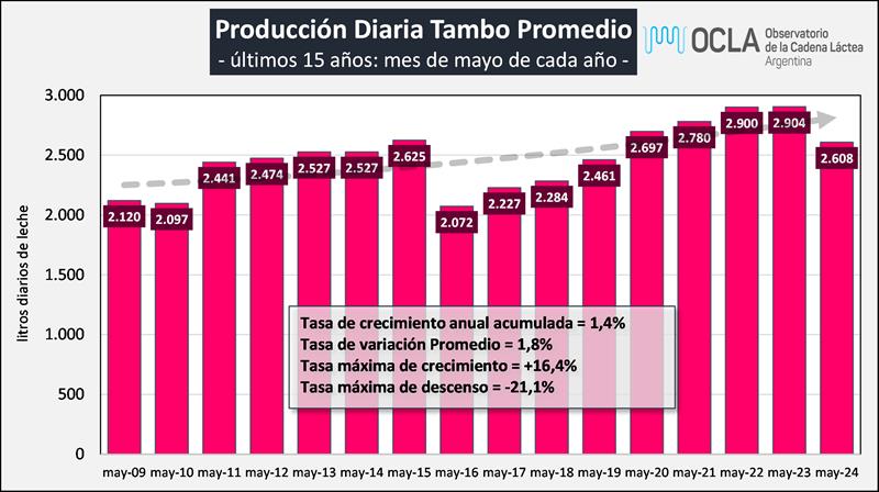 Sobre la base de la producción mensual y la cantidad anual de tambos (SENASA), podemos inferir el tamaño del tambo promedio, unos 2.608 litros de leche diarios para mayo de 2024, una producción inferior al año anterior (-10,2%). En el período 2016-2023 el tambo promedio creció a una tasa del 4,94% anual, situación que se ve interrumpida en 2024 por los efectos mencionados en nuestros informes anteriores.
