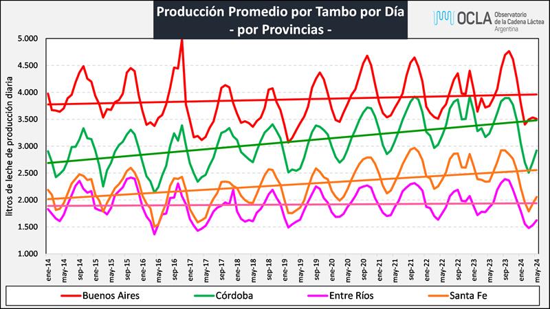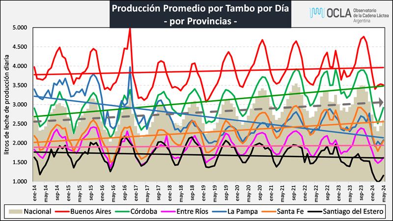 Por último, en el gráfico de abajo se muestra la tendencia en la evolución del tambo promedio nacional y por provincia, donde hay provincias como Córdoba con una importante tendencia al crecimiento (mayo R cuadrado), en la producción de sus unidades productivas, seguida por Santa Fe y luego el resto con una tendencia estable y un solo caso negativa.