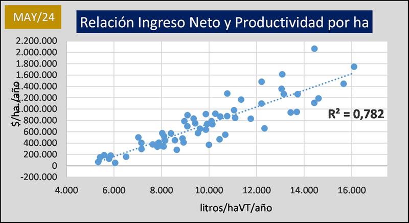 Por último, incorporamos el gráfico donde se obtiene la mayor correlación entre las variables económicas y productivas, en este caso la relación entre la Productividad (medida en litros de leche por hectárea y por año) y el Ingreso Neto.