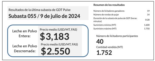 Subasta N° 055 del GDT - Pulse 9/7/2024![]() La subasta Nº 055 se ha llevado ha cabo en el día de hoy, martes 9 de julio, donde el precio promedio obtenido para la LPE ha sido de 3.183 S$/t, el cual representa una baja de 5,9% respecto a lo publicado en la última GDT pulse (3.381 US$/t) y 1,1% abajo respecto al último evento del GDT (3.218 US$/t). Para la Leche en Polvo Descremada, el precio de la misma fue de 2.550 US$/t, lo que representa una subida de 0,5%. ¿Qué es el GDT pulse? Es una prueba piloto que, inicialmente, ofrecerá subastas en semanas alternas entre los eventos comerciales de GDT (2do y 4to martes de cada mes, 5to también, si lo hubiere) durante un período de seis a doce meses Las subastas ofrecerán: Leche en Polvo Entera Regular, Período de contrato 2 y Leche en Polvo Descremada. Los precios descubiertos a través de las subastas de GDT Pulse serán complementarios a los precios proporcionados por los Eventos GDT. Estos últimos seguirán siendo los eventos de gran volumen y alta liquidez, mientras que GDT Pulse tiene la intención de proporcionar precios de manera provisional. Una descripción más detallada de la prueba piloto y las preguntas más frecuentes (FAQ) están disponibles en la página del globaldairytrade globaldairytrade.info