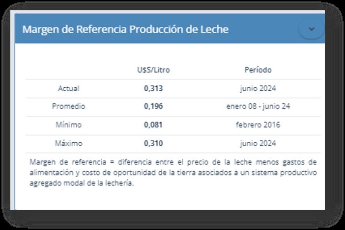 En el cuadro puede observarse que el margen promedio para el mes de junio del 2024 fue US$ 0,313/litro de leche, este margen es un 0,3% superior al del mes anterior y un 21,3% superior respecto al de igual mes del año anterior. Además, está 59,7% por encima del promedio y es el valor más alto registrado desde que se elabora esta serie (16 años y medio).