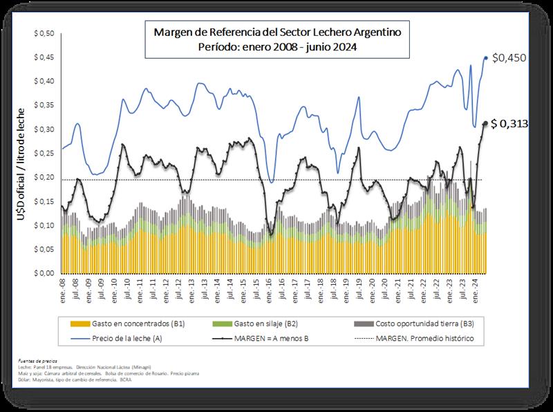 A partir de dicho antecedente, se realizó una adaptación para la lechería de Argentina, que se ha denominado “margen de referencia” el cual se calcula como la diferencia entre el precio de leche oficial y un vector de gastos que incluye alimentación suplementaria (concentrados y silaje) y el costo de oportunidad de la tierra.