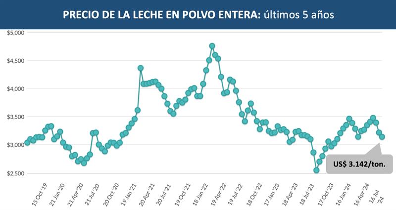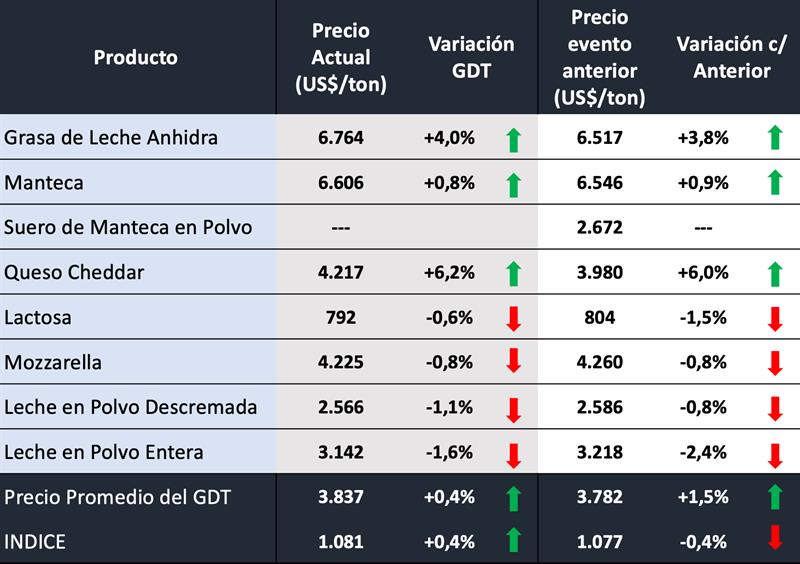 Evento N° 360 del Global Dairy Trade 16/7/2024![]() ![]() Observación metodológica Este documento explica la diferencia entre el índice de precios GDT y el cambio porcentual más simple de los precios medios ponderados. -Precio promedio (EE.UU./MT, FAS) este es el precio promedio de ganancia en todos los productos relevantes, ponderado por la cantidad de cada especificación vendida. -GDT Price Index indica el promedio del cambio porcentual en los precios para cada especificación, ponderado por la cantidad de cada especificación vendida. GDT proporciona un cambio en el índice de precios de GDT del evento anterior para todos los productos, además de un equivalente para cada grupo de productos y cada combinación de grupo de productos/período de contrato. El índice de precios proporciona un reflejo más preciso de los movimientos de precios entre los eventos comerciales. Si compara los precios medios entre dos eventos comerciales adyacentes y calcula el cambio porcentual, esto puede diferir del cambio en el índice de precios de GDT para el mismo período. La diferencia refleja los diferentes métodos de cálculo. [..] el índice de precios evita el sesgo que puede surgir como resultado de los cambios en la cantidad vendida globaldairytrade.info