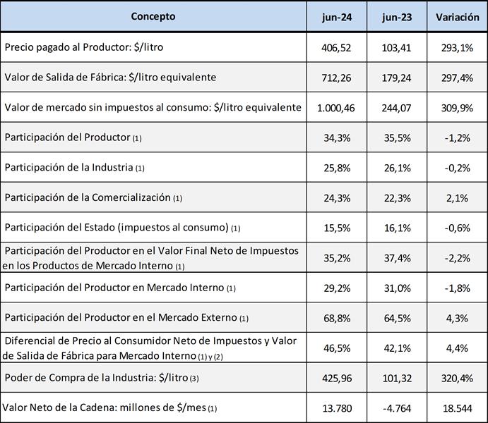 La cadena presenta un resultado positivo en junio de 2024 de $ 13.780 millones (1,9 centavos de dólar por litro de leche equivalente). El sector industrial tiene un resultado estimado positivo de $ 17.830 millones y el sector primario tiene un resultado negativo de $ 4.050 millones, lo que indicaría un precio de equilibrio necesario en torno de los $ 411 para cubrir todos los costos operativos y el costo de oportunidad del capital.