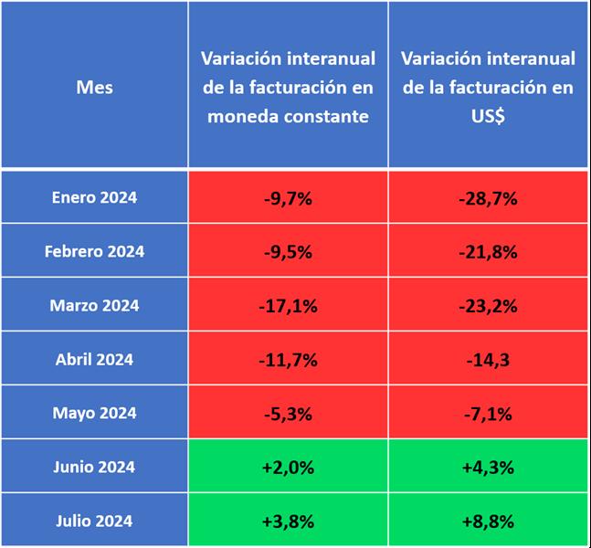Si analizamos la evolución de la facturación en pesos constantes, mes a mes en lo que va del año 2024, podemos observar que se aceleró la caída en marzo y luego, producto de los mejores precios y una desaceleración en la caída interanual de la producción, la facturación comienza a recomponerse y ya en junio y julio se supera al año anterior tanto en pesos constantes como en dólares: