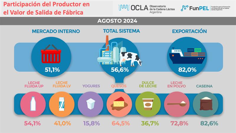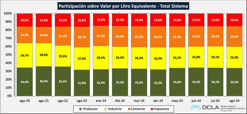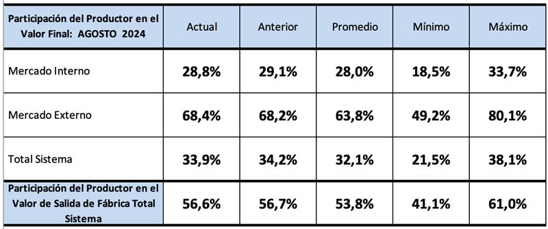 La participación del productor en el total del sistema fue para agosto de 2024 del 33,9%, 0,3 puntos por debajo del mes anterior, y 1,8 puntos por encima de la media del 32,1%. Desmejora muy levemente los valores finales de mercado interno (-0,3) y los de mercado externo mejoran 0,2 puntos porcentuales, pero siguieron muy por encima de la media histórica de la serie disponible (63,8%). La participación del productor sobre el valor de salida de fábrica (precio al que vende la industria) fue de 56,6%, 0,1 puntos por debajo del mes anterior y 2,8 puntos por arriba del promedio de la serie (53,8%).