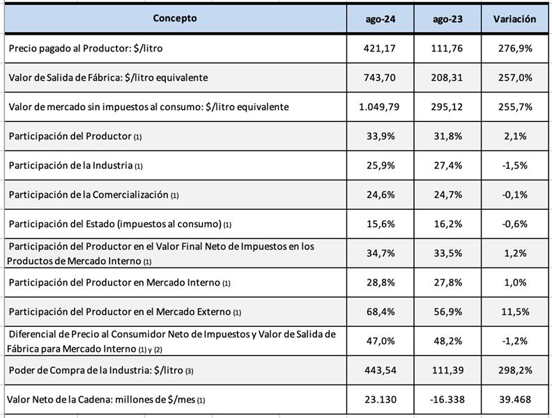 En primer lugar, se puede resaltar que el incremento interanual del precio de la leche al productor (276,9%), está por encima del incremento del valor que paga el consumidor (255,7%), y el valor de salida de fábrica (precio al que vende la industria) 257,0%.