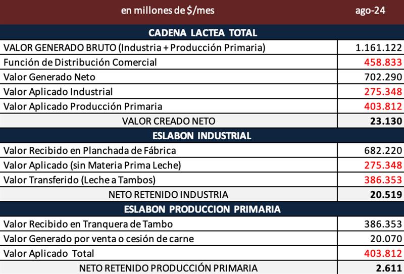 La cadena presenta un resultado positivo en agosto de 2024 de $ 23.130 millones. El sector industrial tiene un resultado estimado positivo de $ 20.518 millones (US$ 21,8 M) y el sector primario tiene un resultado positivo de $ 2.611 millones.