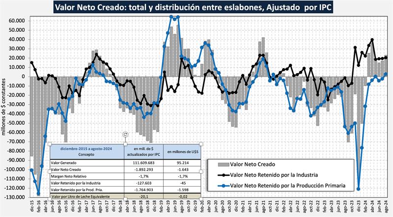 El gráfico siguiente muestra los resultados sectoriales actualizados por IPC y en el cuadro se puede ver claramente qué en estos últimos 9 años, la cadena no retuvo del valor que generó, $ 20,1 o US$ 0,02 por litro de leche equivalente.