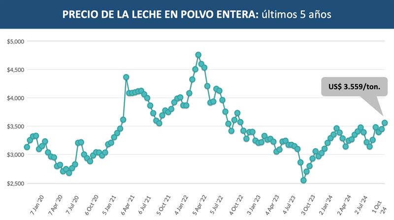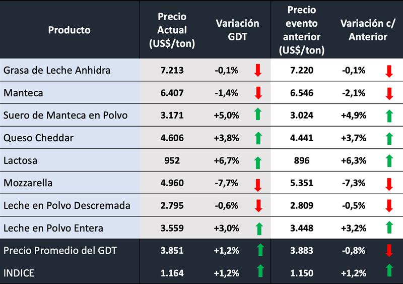 Evento N° 365 del Global Dairy Trade 1/10/2024![]() ![]() Observación metodológica Este documento explica la diferencia entre el índice de precios GDT y el cambio porcentual más simple de los precios medios ponderados. -Precio promedio (EE.UU./MT, FAS) este es el precio promedio de ganancia en todos los productos relevantes, ponderado por la cantidad de cada especificación vendida. -GDT Price Index indica el promedio del cambio porcentual en los precios para cada especificación, ponderado por la cantidad de cada especificación vendida. GDT proporciona un cambio en el índice de precios de GDT del evento anterior para todos los productos, además de un equivalente para cada grupo de productos y cada combinación de grupo de productos/período de contrato. El índice de precios proporciona un reflejo más preciso de los movimientos de precios entre los eventos comerciales. Si compara los precios medios entre dos eventos comerciales adyacentes y calcula el cambio porcentual, esto puede diferir del cambio en el índice de precios de GDT para el mismo período. La diferencia refleja los diferentes métodos de cálculo. [..] el índice de precios evita el sesgo que puede surgir como resultado de los cambios en la cantidad vendida globaldairytrade.info