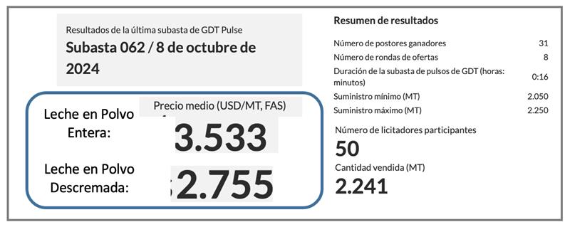 La subasta Nº 062 se ha llevado ha cabo en el día de hoy, martes 8 de octubre, donde el precio promedio obtenido para la LPE ha sido de 3.533 S$/t, el cual representa una leve caída de 0,3% respecto a lo publicado en la última GDT pulse (3.544 US$/t) y de 0,7% respecto al último evento del GDT (3.559 US$/t).