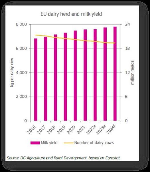 UNION EUROPEA: Perspectivas de corto plazo 17/10/2024Las existencias ajustadas respaldan los precios firmes Puntos clave Las entregas de leche de la UE siguen aumentando en 2024 y se prevé que aumenten marginalmente un 0,2% en 2025. El aumento de las producciones individuales compensará la disminución del ganado lechero. Los precios de la leche se estabilizaron muy por encima de la media de cinco años en 2024, lo que alivió las presiones sobre los márgenes de los productores. Es probable que las exportaciones se mantengan moderadas en medio de la débil demanda mundial y los desafíos de competitividad de los precios. Leche cruda La Comisión Europea espera que las entregas de leche en la región aumenten un 0,5% en 2024 según las últimas perspectivas a corto plazo de la UE. Esto es ligeramente superior al aumento del 0,4% previsto en las perspectivas de primavera. A pesar de los desafíos meteorológicos y la disminución del tamaño del ganado, la disponibilidad y la calidad de los pastizales y el forraje respaldaron un aumento de las entregas. Sin embargo, se observaron movimientos variados en la producción en los diferentes países. Según los últimos datos disponibles, en julio las entregas aumentaron en Francia, Italia, Polonia y España, mientras que cayeron en Irlanda y los Países Bajos tras el impacto de las condiciones húmedas. Se espera que el suministro de sólidos lácteos se mantenga estable. Los precios de la leche cruda se estabilizaron un 17 % por encima de la media de cinco años en agosto de 2024. Los pastizales están en condiciones medias en Europa occidental y las condiciones meteorológicas siguen siendo variadas entre las regiones. La primavera húmeda en Irlanda afectó a las tierras de cultivo, mientras que las condiciones cálidas y secas en Europa oriental y meridional afectaron al crecimiento de los pastos. Como nota positiva, los precios de los fertilizantes están bajando en comparación con 2022 y los precios de la energía se han estabilizado. Esto podría aliviar las presiones sobre los márgenes de los agricultores. Se prevé que el tamaño del rodeo lechero continúe su tendencia descendente a largo plazo del 0,3 %. Sin embargo, los rendimientos siguen aumentando un 0,9% en 2024, aunque a un ritmo más lento en comparación con 2023. La disminución del tamaño del rodeo y el aumento de los rendimientos apuntan a un suministro de leche bastante estable. Tamaño del rebaño lechero de la UE: ![]() traducido y extractado por el OCLA del newsletter de AHDB Dairy por Soumya Behera – Analista Senior de Lechería