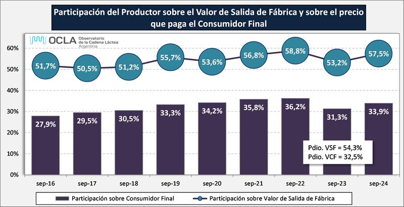 La participación del productor en el total del sistema fue para septiembre de 2024 del 33,9%, igual que el mes anterior, y 1,8 puntos por encima de la media del 32,1%. Desmejora muy levemente los valores finales de mercado interno (-0,1) y los de mercado externo subieron 1,9 puntos porcentuales, pero siguieron muy por encima de la media histórica de la serie disponible (63,9%). La participación del productor sobre el valor de salida de fábrica (precio al que vende la industria) fue de 57,5%, 0,9 puntos por encima del mes anterior y 3,7 puntos por arriba del promedio de la serie (53,8%).