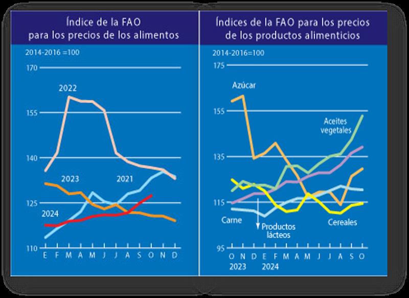 El índice de precios de los productos lácteos de la FAO se situó en octubre en un promedio de 139,1 puntos, esto es, 2,5 puntos (un 1,9 %) más que en septiembre y 24,5 puntos (un 21,4 %) por encima de su valor de hace un año. El acumulado del período enero-octubre fue 2,1% superior al acumulado de igual período del año anterior. Los precios internacionales del queso registraron el mayor aumento, como consecuencia de la limitada disponibilidad de la oferta para satisfacer la demanda de importación de suministros al contado en un contexto de fortaleza de las ventas internas, especialmente en la UE, donde se dio una caída estacional de la producción lechera. Los precios mundiales de la manteca también subieron en octubre por 13º mes consecutivo, impulsados por la gran demanda interna, las limitadas existencias y el descenso estacional de la producción lechera en Europa occidental. Por el contrario, disminuyeron las cotizaciones de la leche en polvo, sobre todo la descremada, debido al aumento estacional de la producción lechera en Oceanía y a la debilidad de la demanda mundial de importaciones.