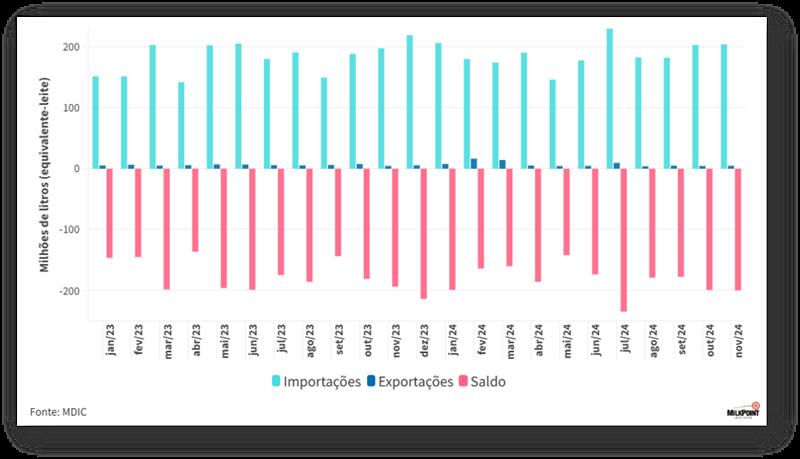 En noviembre, según datos de la Secretaría de Comercio Exterior (SECEX), el saldo registrado en la balanza comercial láctea fue de -199 millones de litros equivalentes en leche, en línea con lo observado en octubre. Incluso con el aumento de las exportaciones, las importaciones también mostraron un pequeño aumento, manteniendo un alto déficit en la balanza comercial, como se puede ver en el gráfico.