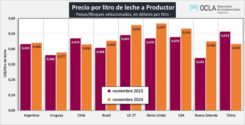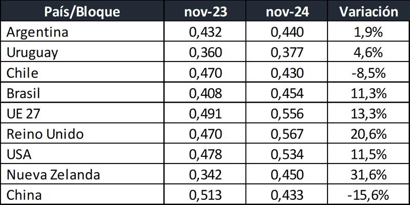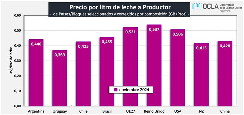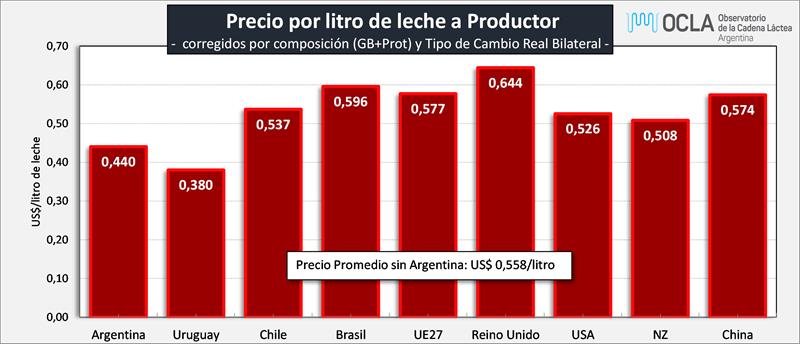 Precios de Leche Cruda en los principales Países/Bloques 10/1/2025Precio de la Leche al Productor en dólares por litro: ![]() Fuentes: DNL-MAGyP, INALE, ODEPA, CEPEA/ESALQ USP, EMMO, AHDB, USDA y CLAL, respectivamente. Precios en Reales, Euros y NZ$, convertidos a dólares al cambio oficial, al igual que los precios cada 100 libras de USA, divididos por 45,359. No es correcta la comparación de leche tal cual ya que comparamos “productos diferentes”. A pesar de no contar con todos los atributos de calidad composicional e higiénico sanitarios a que hacen referencia estos diferentes precios, realizamos al menos las correcciones por composición y por la comparación entre los tipos de cambio. Ejemplo: el precio de la leche de Argentina es para una composición de 7,02% de Sólidos Útiles (3,64% de GB + 3,38% de Proteína), el precio de Nueva Zelanda es para una leche estándar de 7,60% de Sólidos Útiles (4,20% de GB + 3,40% de Proteína). La serie de precios de Argentina compara el precio en $ de panel 18 con el dólar Mayorista BCRA Referencia de Comunicación “A” 3500, si lo convertimos al tipo de cambio de exportación de noviembre 2024 corresponde el dólar del Decreto 28/2023 que establece un tipo de cambio 80% mayorista BCRA y 20% Contado con Liquidación con lo que el precio en lugar de ser US$ 0,440 sería de US$ 0,427. ![]() Precio de la Leche al Productor en dólares por litro, corregidos por Sólidos Útiles (Grasa Butirosa + Proteína): ![]() Observaciones: los precios en el gráfico de arriba han sido corregidos sólo por sólidos útiles (grasa butirosa y proteína) y no por el resto de atributos que hacen a la calidad higiénica y sanitaria, ni tampoco por tipo de cambio real bilateral con cada uno de esos países/bloques. Precio de la Leche al Productor en dólares por litro, corregidos por Sólidos Útiles (Grasa Butiros + Proteína) y por Tipo de Cambio Real Bilateral (BCRA): ![]() En este último gráfico se presentan los precios del segundo gráfico (corregidos por sólidos útiles) y se los ajusta con el Índice de Tipo de Cambio Real Bilateral que Argentina tiene con cada uno de esos países/bloque. Puede notarse claramente al corregir por tipo de cambio, como el precio de Argentina es inferior a la mayoría del resto de países, por las relaciones desfavorables a nuestro tipo de cambio. Índice de Tipo de Cambio Real Multilateral (ITCRM) y BilateralesEste índice mide el precio relativo de los bienes y servicios de la economía argentina con respecto al de los principales 12 socios comerciales del país, en función del flujo de comercio de manufacturas. Se obtiene a partir de un promedio ponderado de los tipos de cambio reales bilaterales de los principales socios comerciales del país. Se considera la evolución de los precios de las canastas de consumo representativas de los socios comerciales expresados en moneda local en relación con el valor de la canasta de consumo local, constituyéndose como una de las medidas amplias de competitividad (de tipo precio). El ITCRM se elabora y publica de forma diaria, a partir de las cotizaciones de las monedas a las 15 hs. de cada día y contempla un mecanismo de diarización de las estimaciones y de replicación de los últimos datos de los índices de precios representativos para Información aún no conocida. elaborado por el OCLA con información de diferentes fuentes