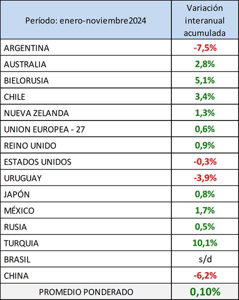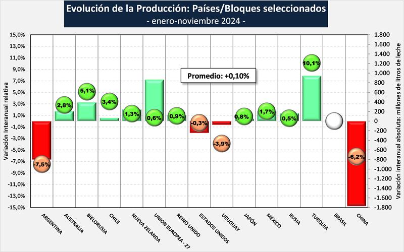 Evolución de la producción mundial de leche 15/1/2025En el cuadro siguiente se toma un grupo seleccionado de los principales países que representan alrededor del 55% de la producción mundial de leche de vaca, en el cual se puede observar una suba de la producción del 0,10%, para el período enero-noviembre del año 2024 respecto a igual período del año 2023. ![]() Por el lado de los proveedores habituales (UE+USA+NZ+UK+AU+ARG+UY), la producción ha sido igual al año anterior hasta noviembre lo cual determina que la oferta en el comercio mundial estuvo medianamente restringida ante un leve crecimiento de la demanda. Cabe recordar que el comercio mundial, descontando el comercio intra Unión Europea, es de sólo el 11 al 12% de la producción mundial, con lo cual cualquier variación en la producción mundial, hace variar en forma significativa los precios y de allí la caracterización de alta volatilidad que se le da a este mercado. ![]() análisis elaborado por el OCLA en base a información de www.clal.it y otras fuentes