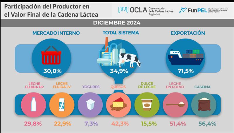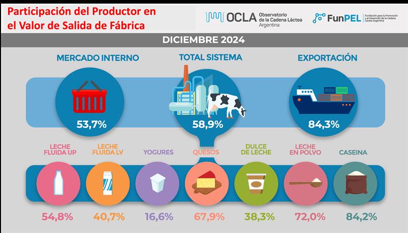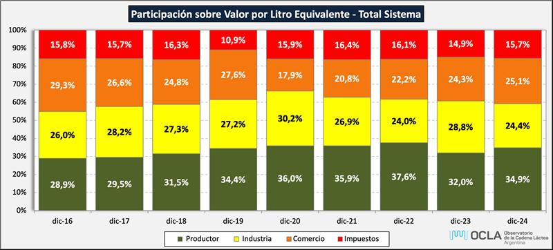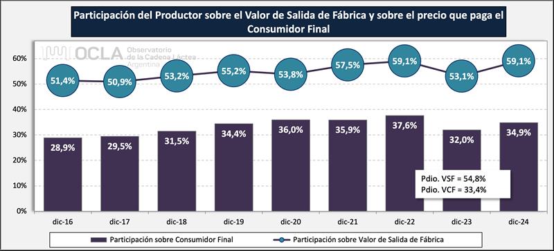 La participación del productor en el total del sistema fue para diciembre de 2024 del 34,9%, 0,1 punto por debajo del mes anterior, y 2,7 puntos por encima de la media del 32,2%. Se mantienen los valores finales de mercado interno (0%) y los de mercado externo cayeron 1,0 puntos porcentuales, pero siguieron muy por encima de la media histórica de la serie disponible (64,1%). La participación del productor sobre el valor de salida de fábrica (precio al que vende la industria) fue de 58,9%, 0,2 puntos por debajo del mes anterior y 5,0 puntos por arriba del promedio de la serie (53,9%).