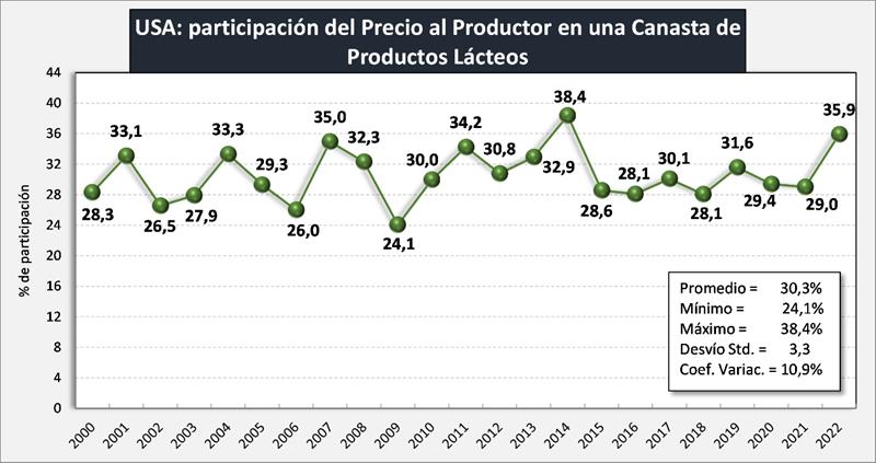 Gráfico elaborado por Departamento de Agricultura de los Estados Unidos con cálculos del Servicio de Investigación Económica, utilizando datos de la Oficina de Estadísticas Laborales y el Servicio Nacional de Estadísticas Agrícolas (USDA: ERS-NASS). ERS compara los precios pagados por los consumidores por los alimentos con los precios recibidos por los agricultores por los productos correspondientes. Este conjunto de datos informa estas comparaciones para una variedad de alimentos que se venden a través de tiendas minoristas de alimentos, como supermercados y supercentros. Las comparaciones se hacen para alimentos individuales y agrupaciones de alimentos individuales-canastas de mercado-que representan lo que compra un hogar típico de los EE. UU. Al por menor en un año. Los costos minoristas de estas canastas se comparan con el dinero que reciben los agricultores por una canasta correspondiente de productos agrícolas. Este conjunto de datos se actualiza regularmente en primavera y nuevamente en otoño, cuando los datos subyacentes estén disponibles. Para una canasta de productos lácteos comprados en tiendas de alimentos en un período base. El índice de precios al por menor se deriva de los datos publicados por la Oficina de Estadísticas Laborales. El valor en tranquera se deriva de los datos publicados por agencias dentro de USDA. El diferencial entre el costo minorista y el valor en tranquera, representa los gastos por procesamiento y comercialización.
