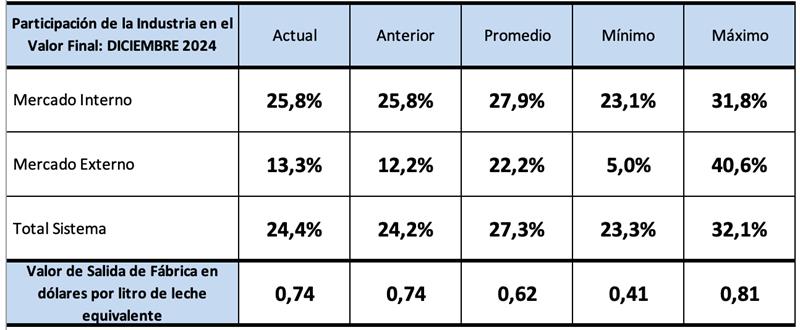 La industria por su parte mejoró muy levemente en diciembre de 2024 su performance de participación en el total del sistema (+0,2), manteniéndose en el mercado interno y mejorando 1,1 puntos en el mercado externo. La facturación total de salida de fábrica por litro de leche equivalente estuvo en US$ 0,74 (igual que el mes anterior), +US$ 0,12 que el promedio de la serie disponible y cerca del máximo logrado en mayo y octubre de 2013 (US$ 0,81). Estos niveles de facturación en ambos mercados como en el total, están muy lejos de los valores que se logran en los principales países lecheros que se ubican en un valor cercano al dólar por litro equivalente (en planchada de fábrica) y que no se dan en Argentina por las interferencias entre el mercado y los actores de la cadena que mencionamos más arriba. Además, este mayor valor de los últimos meses, responde al proceso de retraso cambiario que hemos mencionado más arriba.