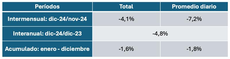 Si analizamos la caía del índice promedio diario del período enero-diciembre 2024 (-1,8%) se debería a la incidencia de una disminución de la producción de leche (-6,5%), compensada por una recuperación de precios en moneda constante.