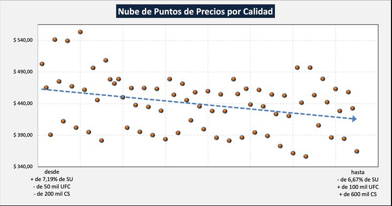 Si elaboramos una nube de puntos con los diferentes precios disponibles en función a las calidades, podemos observar que se da una pendiente descendente de precios a medida que es menor la calidad integral de la leche, pero esa pendiente podría ser mucho más pronunciada si se pretende mejorar/incentivar la mejor calidad de leche.