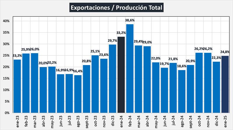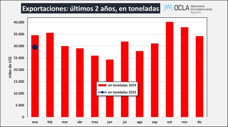 En litros de leche equivalentes (enero 2025), las exportaciones cayeron el 21,0% interanual y representaron el 24,8% de la producción total (en enero de 2024 representaron el 33,2%).