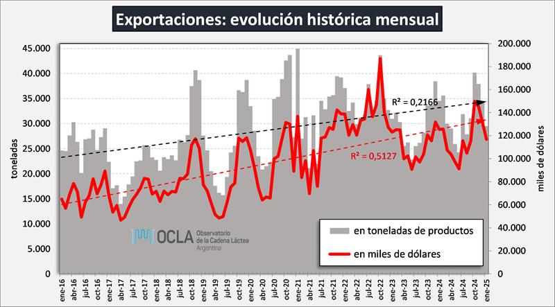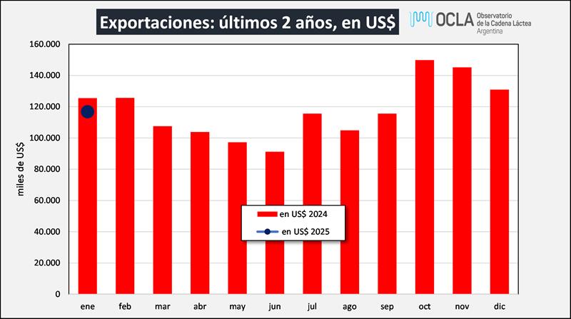 Las exportaciones de productos lácteos en enero de 2025 totalizaron 29.531 toneladas de productos, por un valor de US$ 116,1 millones, bajaron 13,6%, y 10,8% en volumen de productos, y en monto total en dólares, respectivamente, comparadas con el mes anterior.