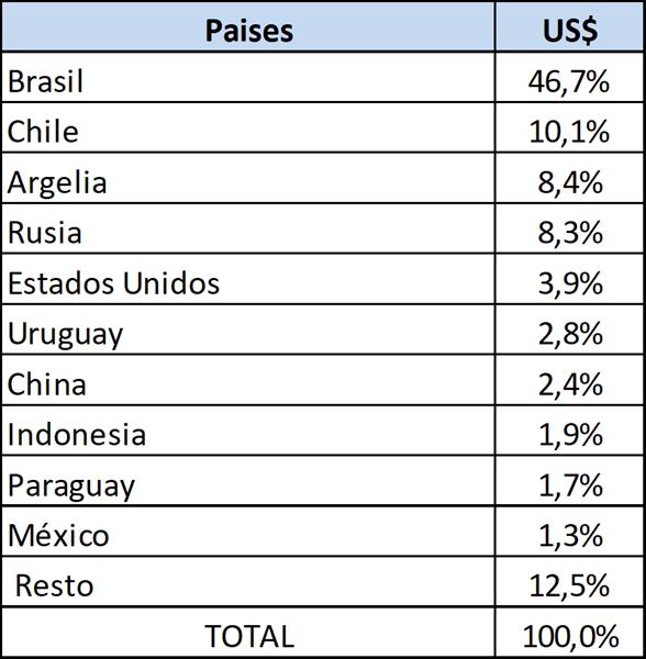 El destino de las exportaciones (en función al monto en dólares) se conformó: