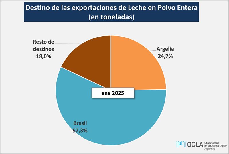 En enero se dio una participación de Brasil del 57,3% y de Argelia del 24,7% para Leche en Polvo Entera, siendo ambos los principales destinos habituales de exportación de nuestro productor más significativo en las exportaciones.