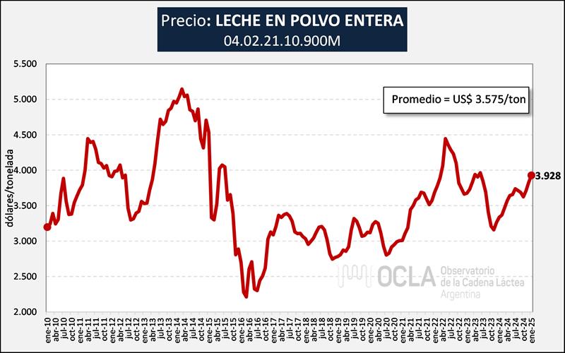 El precio medio de exportación por tonelada fue de US$ 3.931 para enero de 2025, lo que implicó un incremento del 8,3% respecto a enero de 2024. En el caso particular del rubro Leches en Polvo, el precio promedio fue de US$ 3.840/ton., un 14,7% por encima del año anterior.