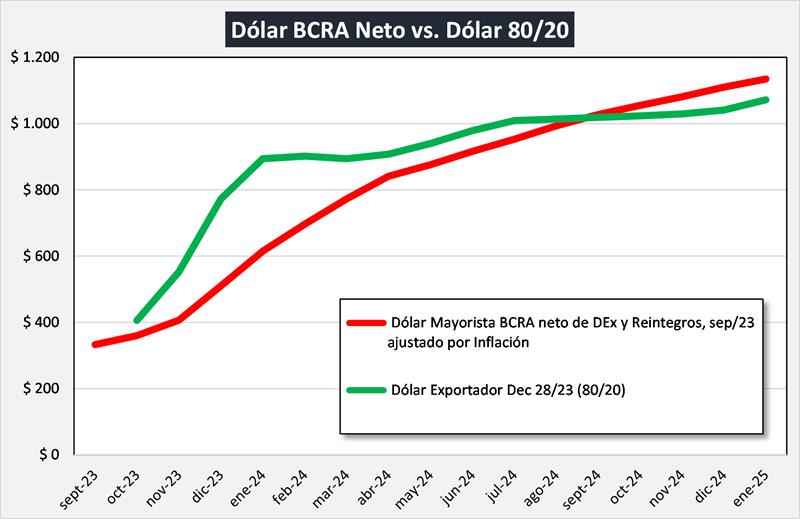 El gráfico final, muestra claramente que el valor del dólar neto de exportación de septiembre 2023 (mayorista BCRA – Derechos de Exportación + Reintegros), ajustado por inflación, es en los últimos meses, superior al dólar especial del Decreto 28/23 (80% mayorista BCRA + 20% CCl), sin derechos de exportación, ni reintegros y luego de una importante devaluación en diciembre 2023.