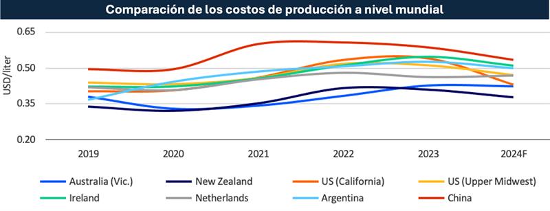 Nueva Zelanda y Australia han competido codo a codo durante los últimos seis años para mantener el título de productor de menor costo entre las ocho regiones evaluadas. Los costos totales promedio de cinco años para Nueva Zelanda y Australia se ubican en 0,37 centavos de dólar por litro en comparación con alrededor de 0,48 centavos para las otras regiones. China sigue siendo el productor con los costos más altos, pero se ha vuelto más competitivo en los últimos tres años.