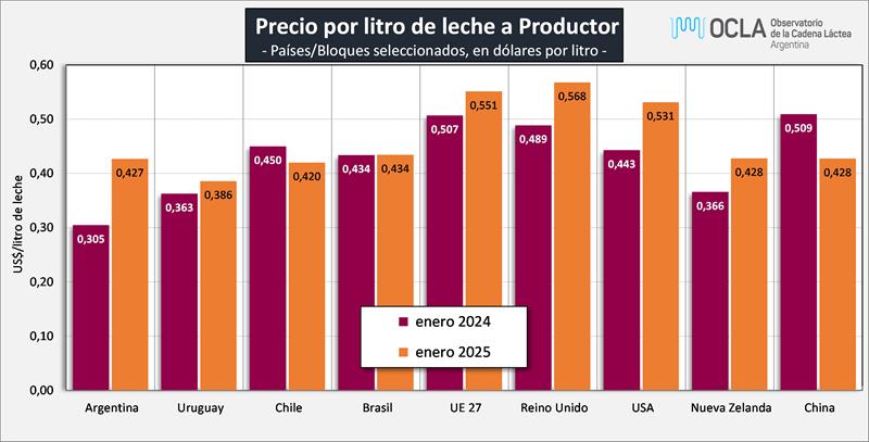 Fuentes: DNL-MAGyP, INALE, ODEPA, CEPEA/ESALQ USP, EMMO, AHDB, USDA y CLAL, respectivamente.