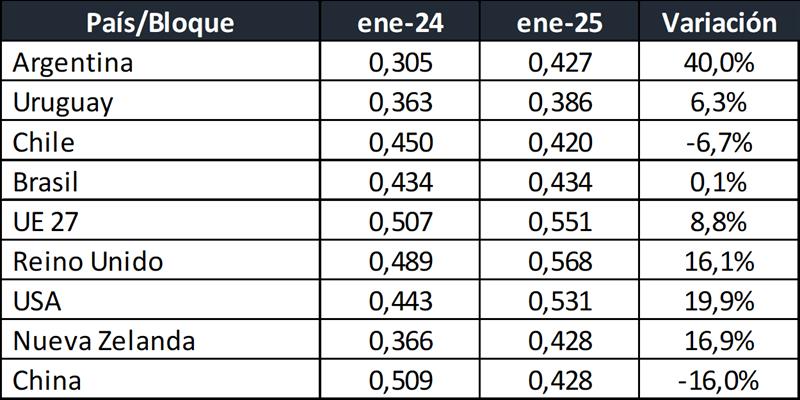 La serie de precios de Argentina compara el precio en $ de panel 18 con el dólar Mayorista BCRA Referencia de Comunicación “A” 3500, si lo convertimos al tipo de cambio de exportación de enero 2025 corresponde el dólar del Decreto 28/2023 que establece un tipo de cambio 80% mayorista BCRA y 20% Contado con Liquidación, el precio fue de US$ 0,416 en lugar de US$ 0,427.
