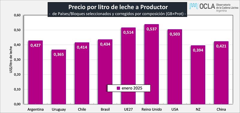 Observaciones: los precios en el gráfico de arriba han sido corregidos sólo por sólidos útiles (grasa butirosa y proteína) y no por el resto de atributos que hacen a la calidad higiénica y sanitaria, ni tampoco por tipo de cambio real bilateral con cada uno de esos países/bloques.