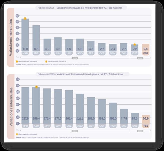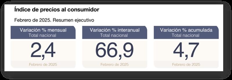 El nivel general del Índice de precios al consumidor (IPC) representativo del total de hogares del país registró en febrero una variación de 2,4% con relación al mes anterior, el acumulado de los dos primeros meses del año ascendió a 4,7% y el interanual llegó al 66,9%.