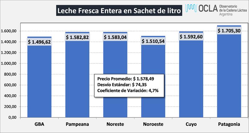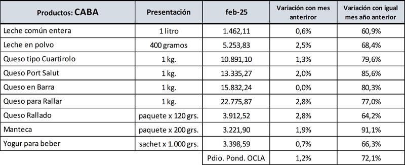 Según datos publicados por la Dirección General de Estadísticas y Censos - Ministerio de Hacienda del Gobierno de la Ciudad de Buenos Aires, los precios de los productos lácteos de esta canasta, tuvieron un crecimiento mensual promedio ponderado del 1,2%, y un incremento interanual del 72,1%. El ponderado es elaborado por OCLA sobre el mismo criterio mencionado para la canasta GBA de INDEC.