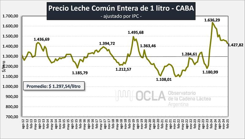 En la leche común entera de litro se observa que el precio de febrero del 2025, es 1,8% inferior al mes anterior en moneda constante, + 0,6% en moneda corriente, y en el interanual está 3,6% por debajo de febrero 2024 actualizado por IPC. Siguiendo en el análisis a moneda constante, el precio de febrero de 2025 se ubica 10,0% por encima de la media de la serie y es 12,7% más bajo que el máximo alcanzado hasta ahora en marzo próximo pasado, y a pesar de los vaivenes con una tendencia estable en los últimos 14 años.