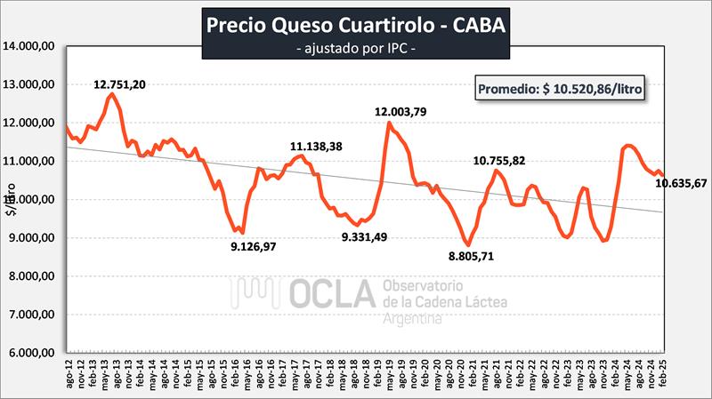 En el caso del queso cuartirolo mantiene una mayor tendencia decreciente en la serie de 14 años. El precio de febrero fue 1,1% superior a la media histórica disponible y estuvo 16,6% por debajo del máximo alcanzado en 2013.