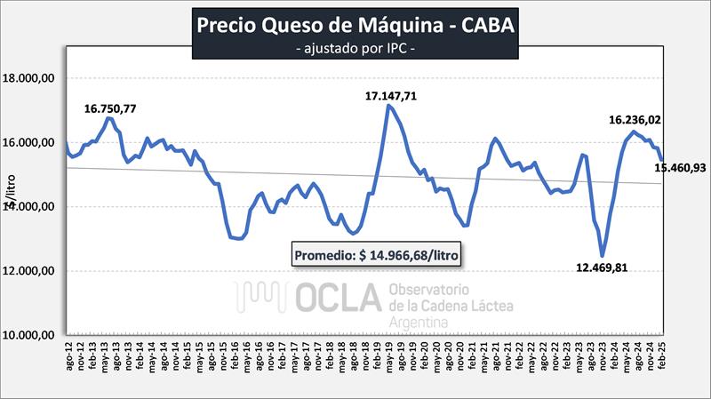 Otro commoditie de mercado doméstico como el queso barra o de máquina presenta un valor 2,3% inferior al mes anterior en moneda constante, con leve tendencia de caída tanto en el largo plazo como también en los últimos 7 meses y el precio de febrero 2025 es un 3,3% superior al promedio histórico disponible en esta serie.
