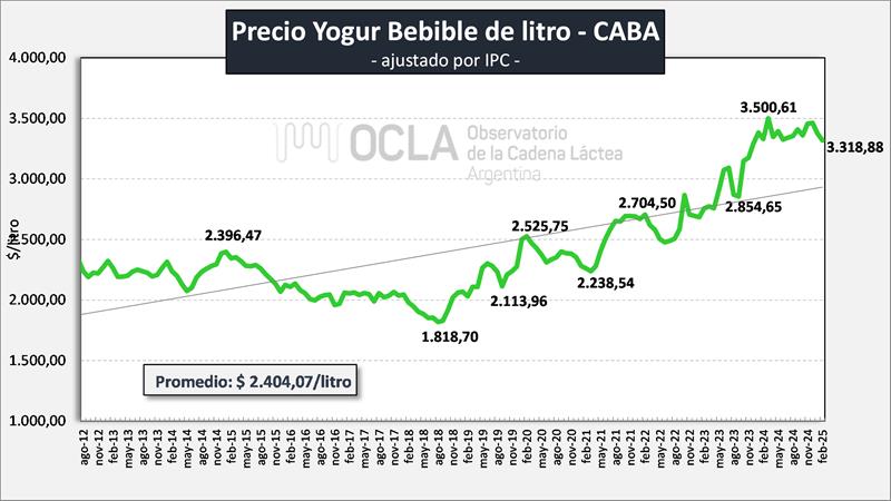 La situación de los yogures bebibles de litro, en principio es diferente, ya que sostienen el nivel de consumo de la categoría, y sus precios se venían ajustan por encima del ritmo inflacionario, con algunos altibajos. El precio actual está 38,0% por encima de la media de la serie. Lamentablemente tiran para abajo el promedio del mix, ya que su aumento de ventas no fue acompañado por las ventas de yogures en pote, postres y flanes que tienen un mayor valor por litro equivalente.