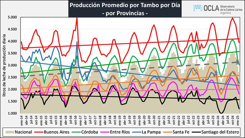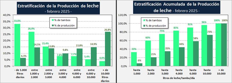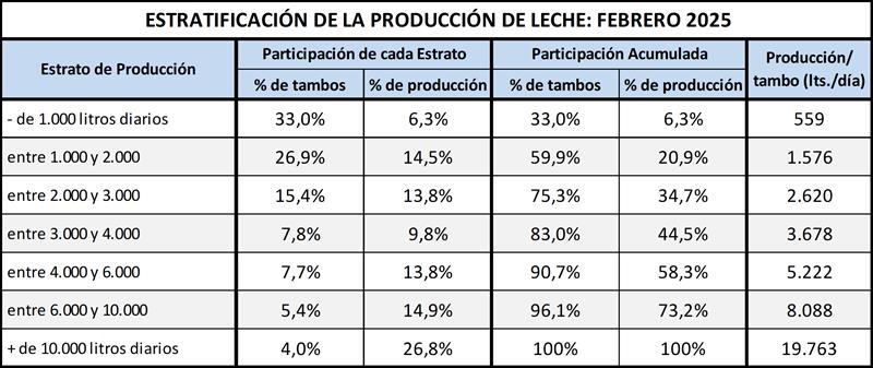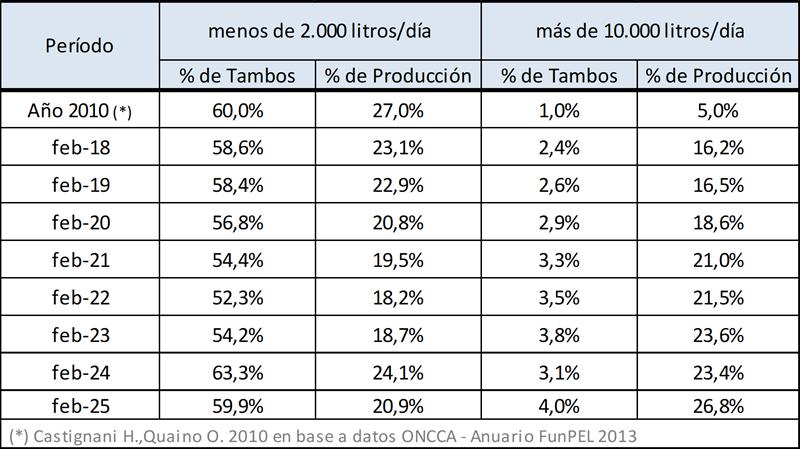 Entre 2010 y 2025 los tambos de menos de 2.000 litros de producción diaria venían reduciendo significativamente su importancia relativa en la producción de leche total y los tambos de más de 10.000 litros diarios de producción, multiplicaron por casi 6 su participación en la producción, a pesar del efecto de caída de la producción total que se dio en 2024.