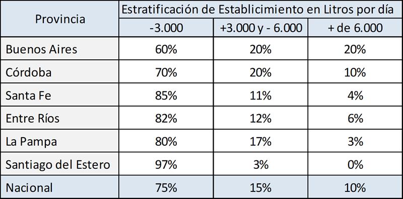 Por su parte, en el gráfico siguientes se puede ver la distribución de los tambos por provincia en base a su tamaño, y se puede concluir que los tambos más grandes están principalmente en Buenos Aires, seguido por Córdoba y el resto de provincia se caracteriza por una prevalencia de tambos de menos de 3.000 litros diarios.